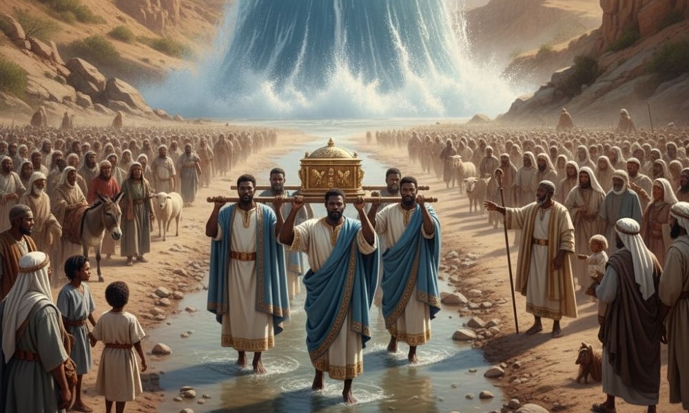 - Crossing the Jordan: The waters part as priests carry the Ark, mirroring the Red Sea.