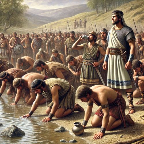 At God’s command, Gideon watched how the men drank from the river. Those who lapped water with their hands were chosen — just 300 warriors, alert and ready. The rest were sent home. (Judges 7:5–7)