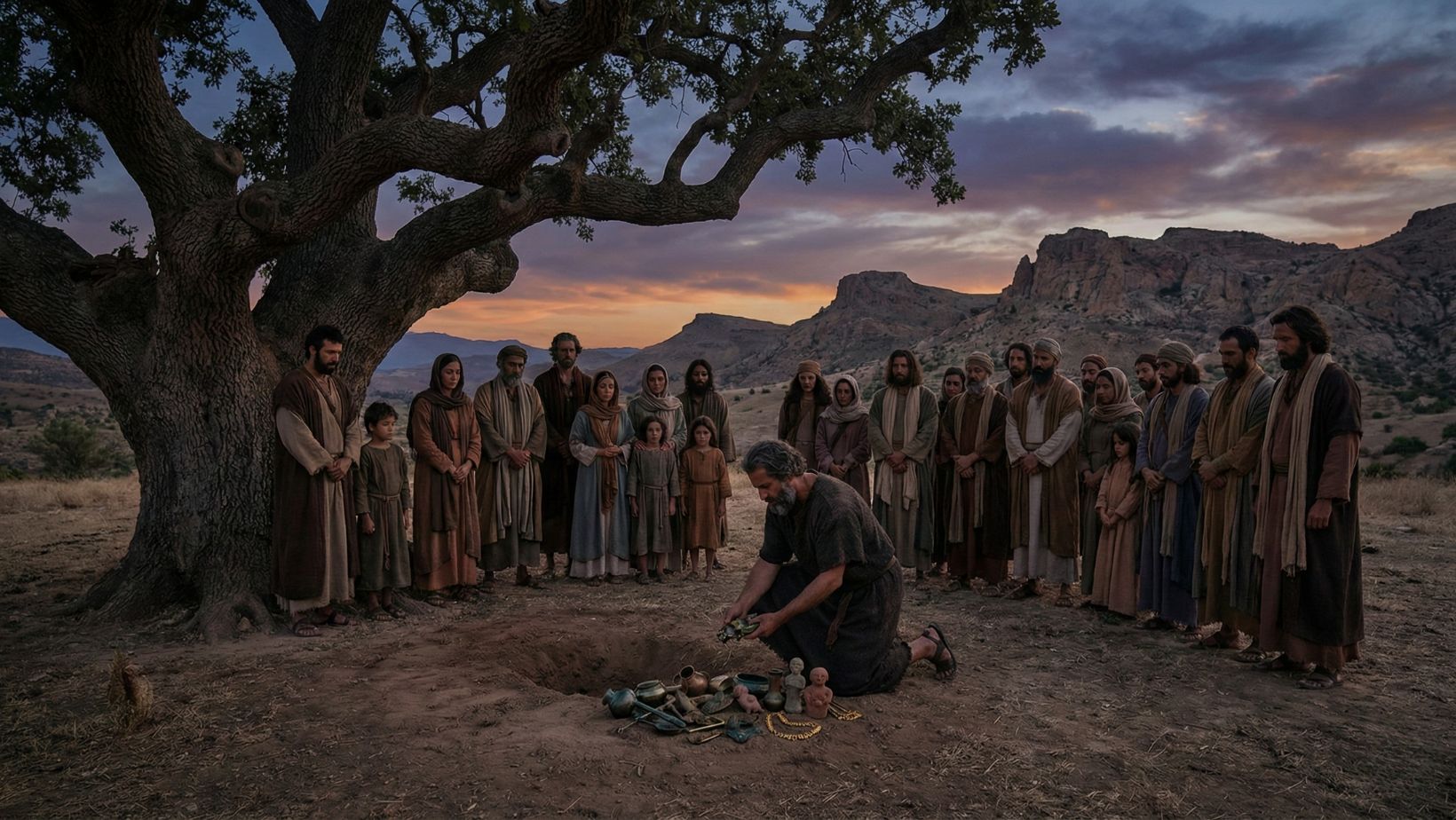 - A Total Break (v. 4): The family surrenders not just idols but also “earrings,” which in the ancient Near East often functioned as amulets associated with pagan deities. Jacob buries them under a “great tree near Shechem,” signifying a permanent burial of their old life before moving to the new.