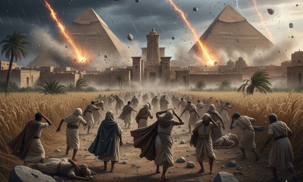 - Hail and Fire (Exodus 9:13–35): A catastrophic storm of hail mixed with fire rained down, destroying crops and people, but sparing Goshen.