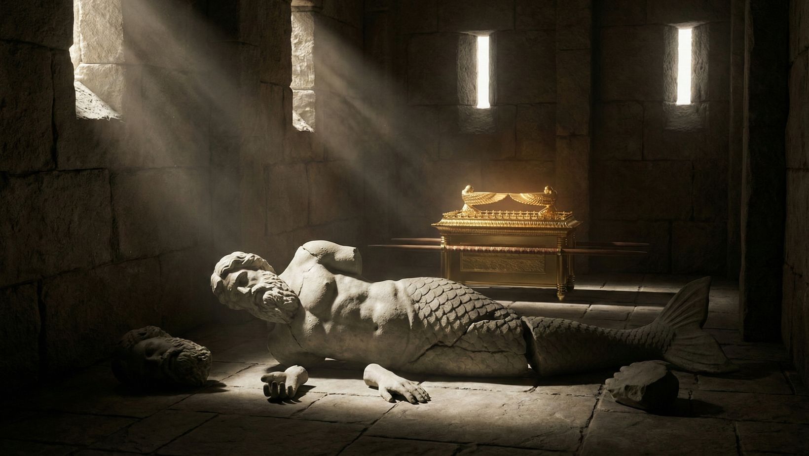 The Ark vs. Dagon: After capturing the Ark of the Covenant in battle, the Philistines placed it in the temple of Dagon in Ashdod as a trophy. The next morning, the statue of Dagon was found fallen on its face. The following day, it was fallen again, with its head and hands broken off. The people of Ashdod were then struck with tumors/plague, forcing them to send the Ark away (1 Samuel 5).