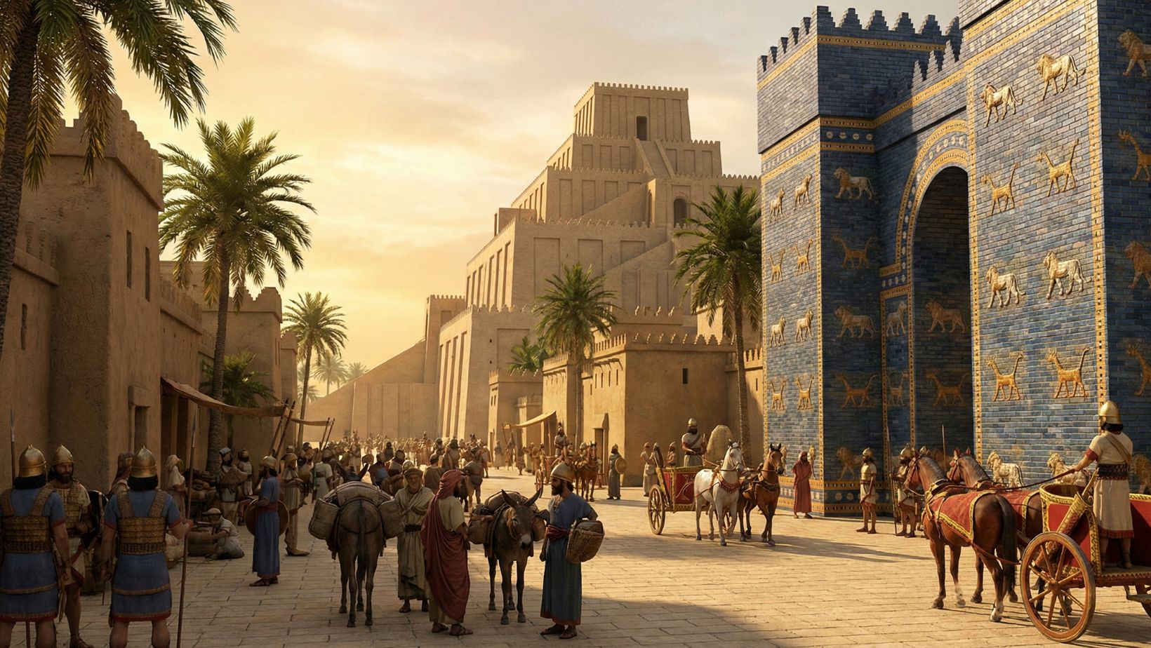 The Ishtar Gate: A massive, blue-glazed brick gate decorated with dragons and bulls (symbols of the god Marduk), through which the Processional Way passed.
