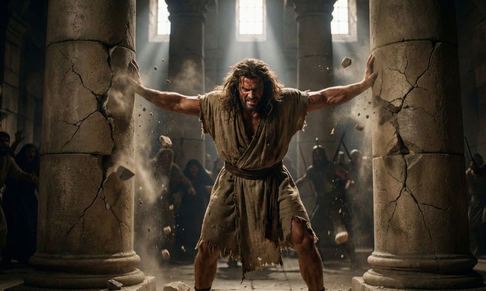 Judges 16:28: Samson’s final prayer — “O Lord God, please remember me and please strengthen me only this once.”